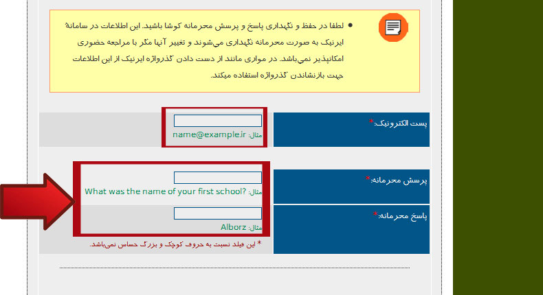 اطلاعاتی که برای پرسش محرمانه و پاسخ آن وارد می کنید را حتما به یاد داشته باشید زیرا برای تغییر گذرواژه نیاز می باشد .
