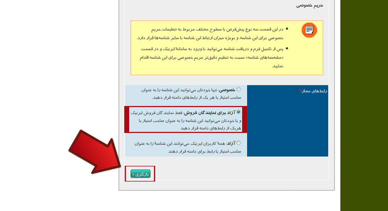 در انتهای صفحه و در قسمت حریم خصوصی رابط‌های مجاز را بر روی گزینه ی "آزاد برای نمایندگان فروش" قرار دهید تا ما بتوانیم دامنه را برای شما ثبت کند سپس بر روی گزینه بازنگری کلیک کنید