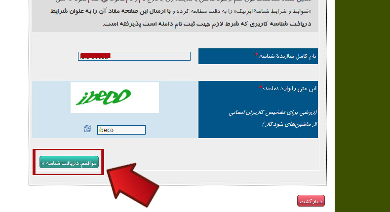 در این مرحله اطلاعاتی را که وارد نموده اید برای شما نمایش داده می شود پس از مطالعه آنها و اطمینان از درست بودن تمام موارد و مطالعه ضوابط و شرایط ثبت شناسه درایرنیک در انتهای صفحه در قسمت" نام کامل سازنده شناسه "نام کامل خود را به زبان انگلیسی بنویسید سپس کد امنیتی موجود در تصویر را در فیلد دوم وارد کنید روی گزینه موافقم ،دریافت شناسه کلیک کنید .