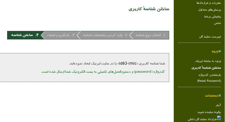 در پایان شناسه ساخته شده( که برای مثال به صورت id63-irnic می باشد) به شما نمایش داده می شود و همچنین یک ایمیل حاوی همین شناسه و پسورد آن برای شما فرستاده می شود. دقت داشته باشید که پس از دریافت این ایمیل، حتما از طریق آدرس https://www.nic.ir/Login وارد حساب خود شده وگذرواژه را عوض کنید. در غیر این صورت ، حساب کاربری شما در مدت 7 روز بسته می شود.